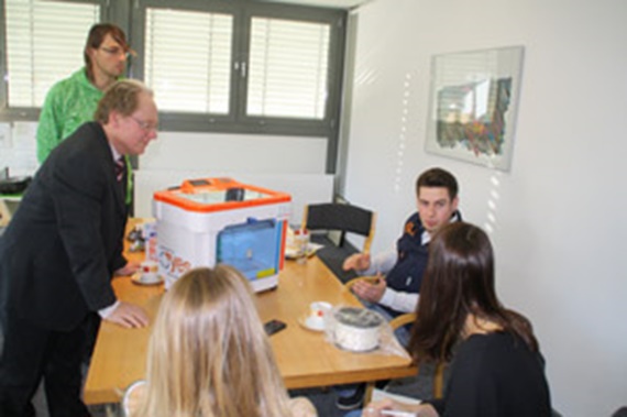 Slavnostní předání 3D tiskárny s učitelem fyziky Thomasem Kerschnerem (vzadu), ředitelem Wolfgangem Knochem (vpravo), zástupcem igus® Albertem Thönnigesem (vlevo) a studenty gymnázia Otty Hahna v Bensbergu