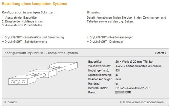In order to design drylin® products for individual customer applications, the configurator is intended in the relevant product pages. drylin® T linear guides, drylin® N low profile linear guides and drylin® SHT spindle-lift tables can be configured. Individual length, potential clearance adjustments and optional accessories are defined at the same time according to requirements.